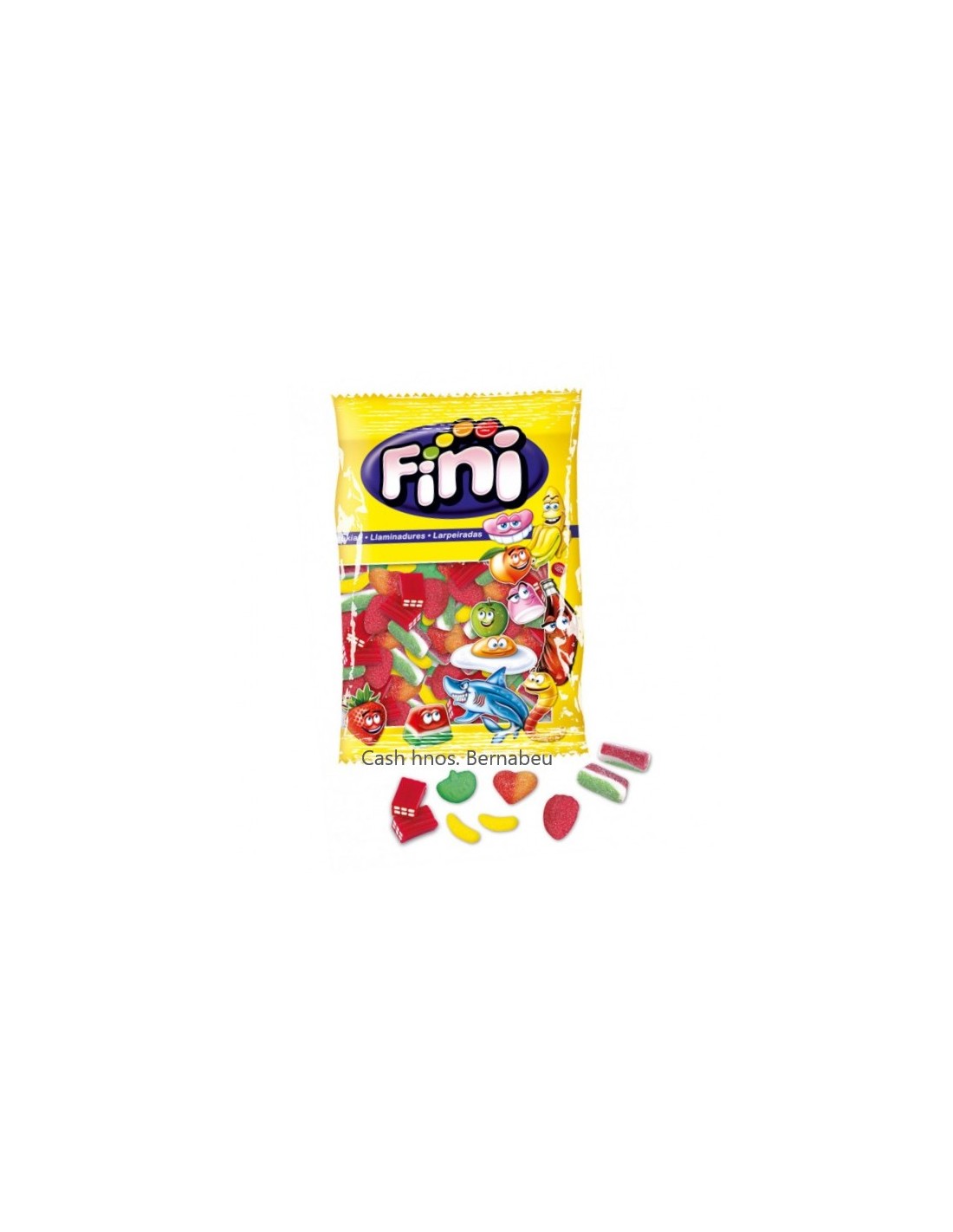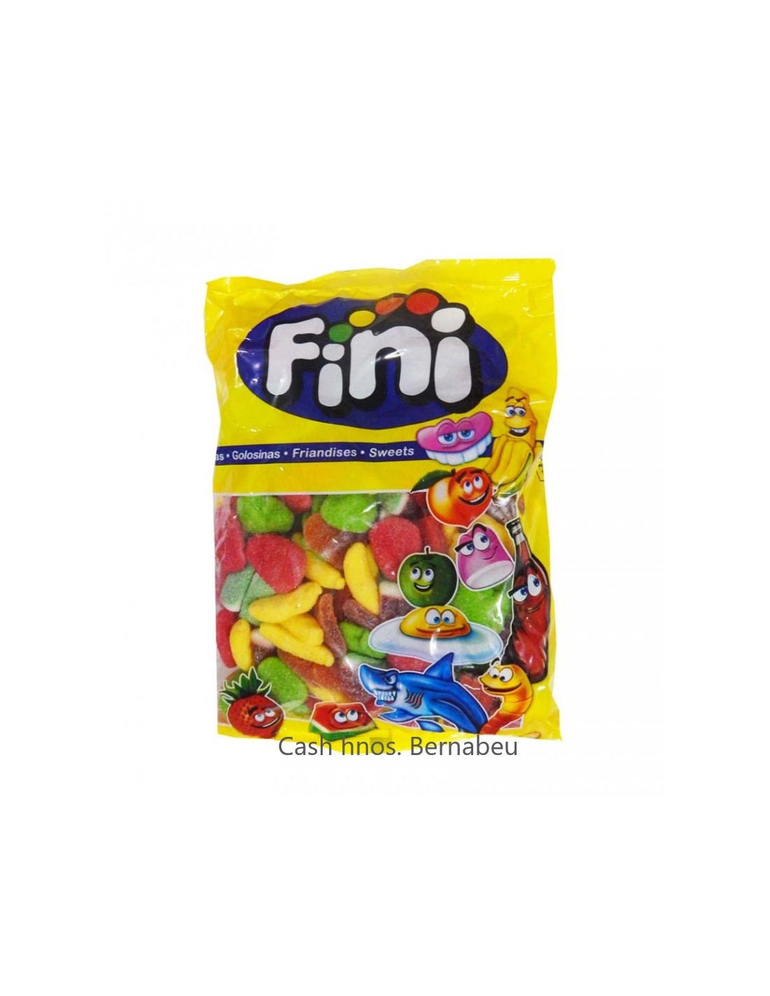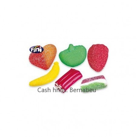 Party mix surtido de varias gominolas distintas recubiertas con azúcar: fresa batida, corazón de melocotón, tajada de sandia, platanos, manzanas y ladrillos en bolsas de 1 kg