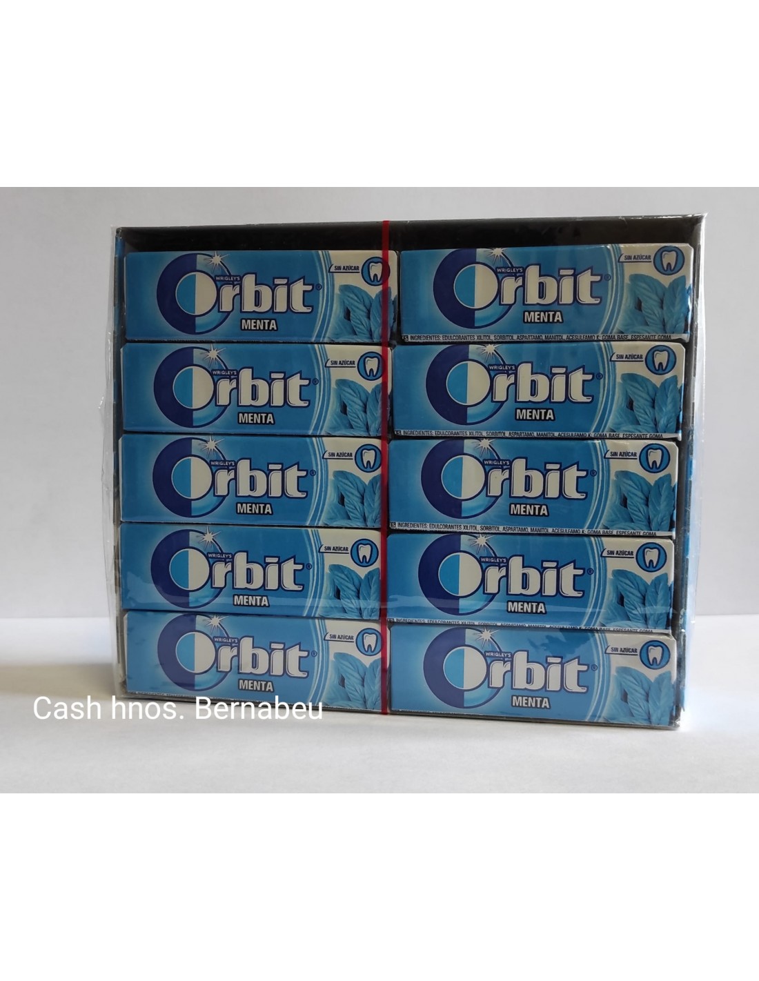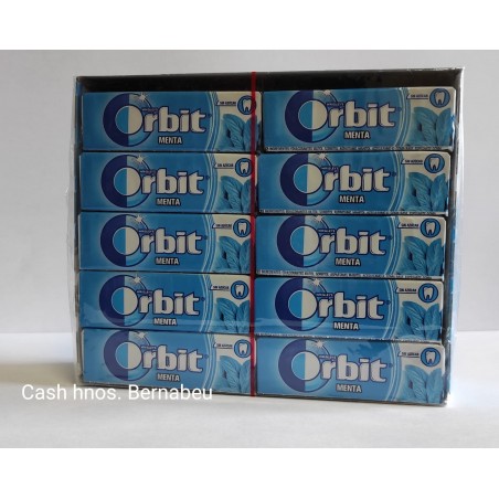 Chicle Orbit de menta. Es una goma de mascar sin azúcar. En grageas. Viene en caja de 30 paquetes,con 10 chicles cada uno.