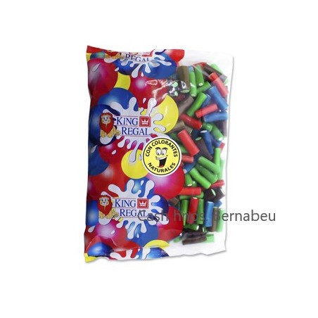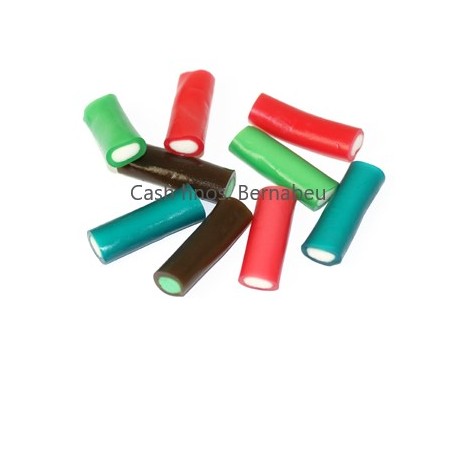 Taco de regaliz surtido de sabores: fresa, manzana, frambuesa y cocacola, colores: rojo, verde, azúl y marron rellenos de nata y cocacola bolsas 1 kg